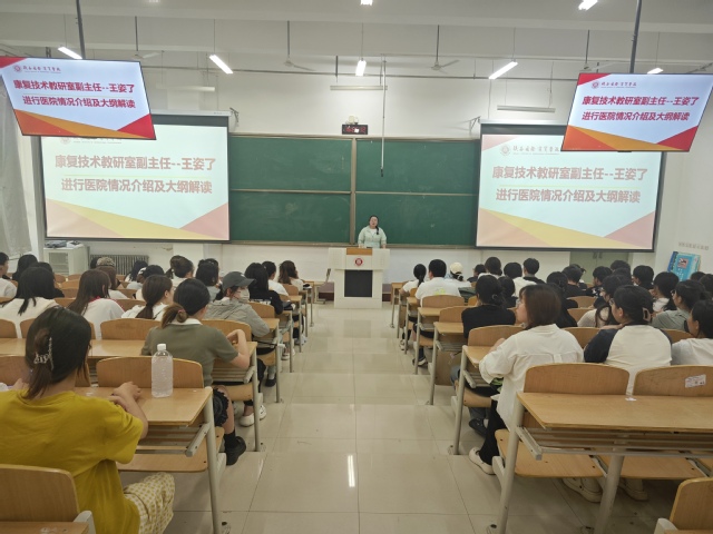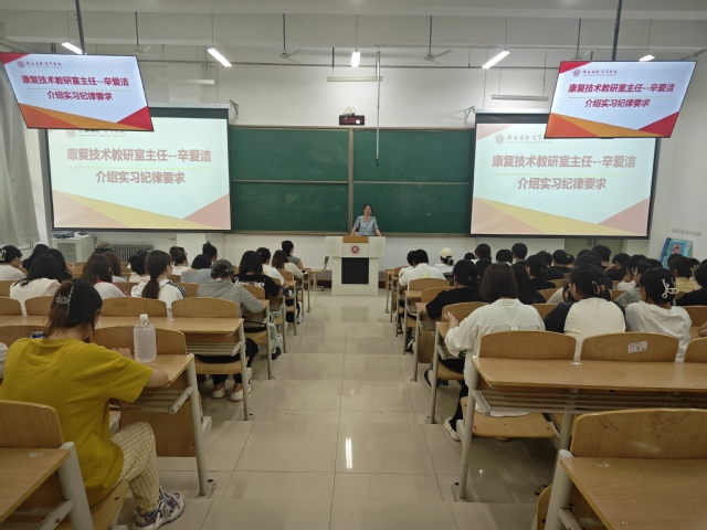 康复技术教研室副主任王姿了接着发言,重点介绍了实习医院的相关情况并解读了实习大纲。她详细说明,本次实习将安排在多家三级甲等医院进行,各医院设施完善、师资雄厚。王副主任详细解读了实习大纲的核心精髓,包括基础技能操作的熟练度、病例分析的深度以及团队协作的高效性,并着重强调学生们需在实习期间全面掌握康复评估技巧和治疗计划制定的精髓,以确保能够顺利达成教学大纲所设定的各项目标。