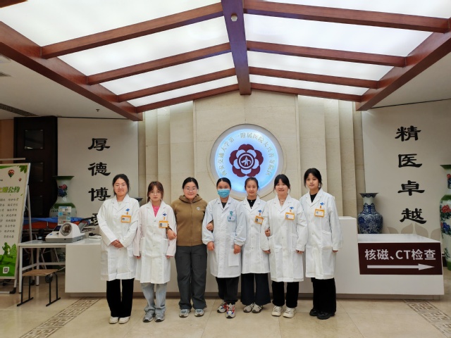 王姿了老师带领同学们去西安交通大学第一附属医院报道,与教学办秘书狄小宁治疗师合影