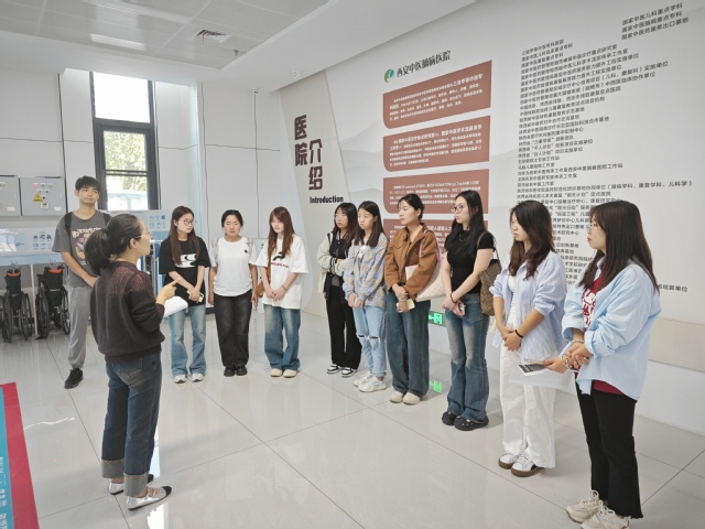 王旭老师带领学生去西安中医脑病医院报道,学生们在听医院齐文莉干事讲解注意事项