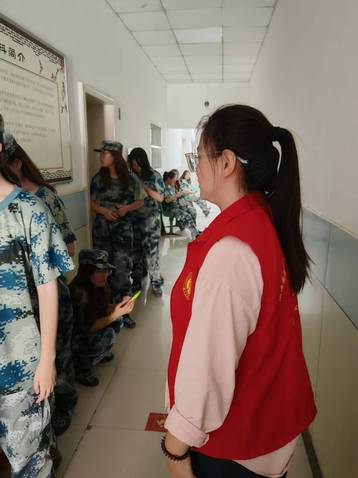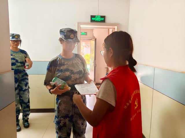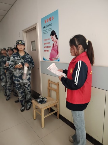清晨,胸片室医护人员提前到岗,细致调试设备、消毒场地,以专业姿态做好准备。与此同时,医学院学生会与团总支的志愿者们身着红色志愿马甲,在胸片室门口、走廊等位置,引导穿迷彩军训服的新生有序排队,还耐心为紧张的新生讲解流程,缓解其情绪。